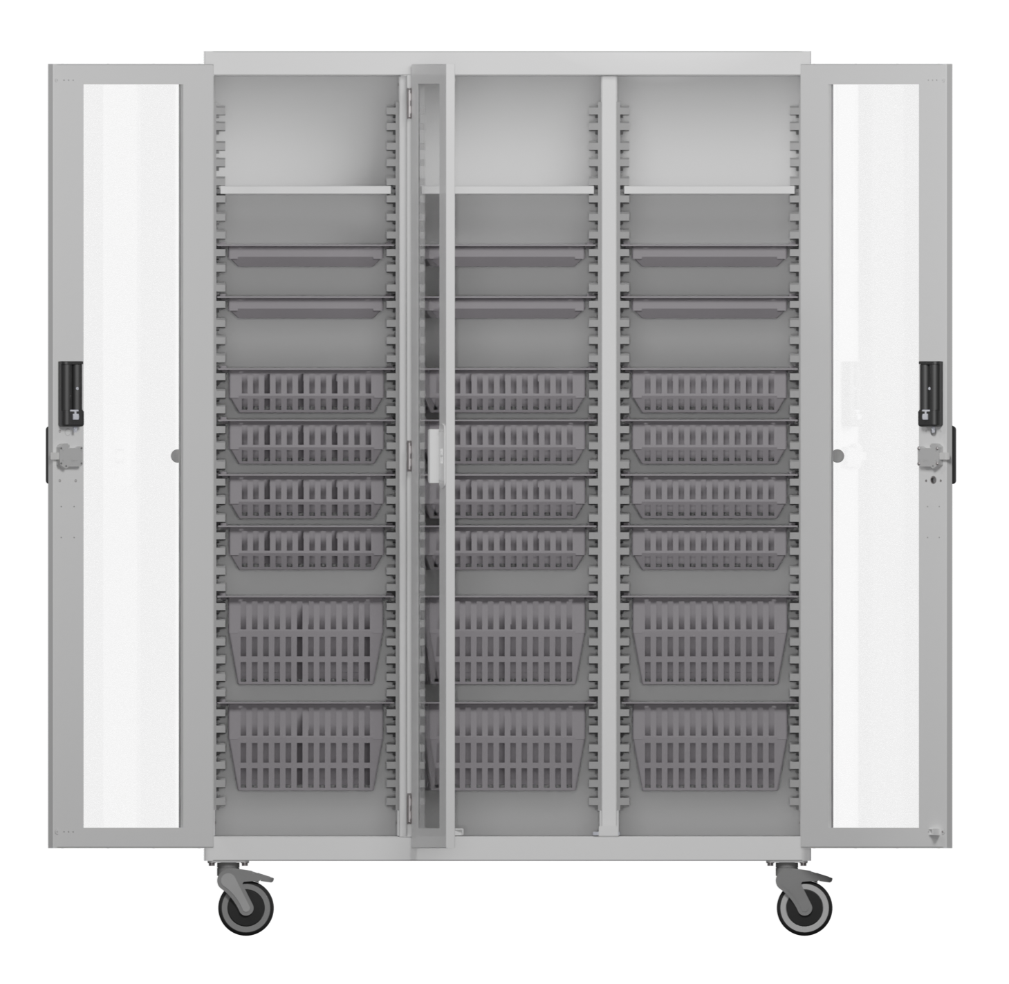 This large cabinet comes configured with heavy-duty shelves but can be easily adjusted in 1-inch increments. Thus allowing for high-density, medical storage within a small footprint. Additional shelves can be purchased separately. This is the largest mobile cabinet we produce that has two center columns.